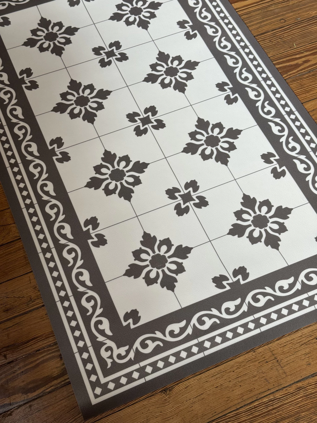 Alfombra estampada, hecha en material vinílico, antideslizante. Tiene un capa UV que las hace resistentes al agua, el sol y la interperie.