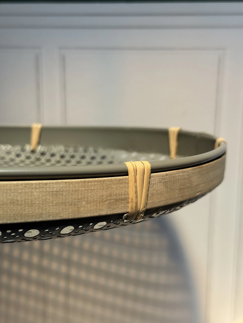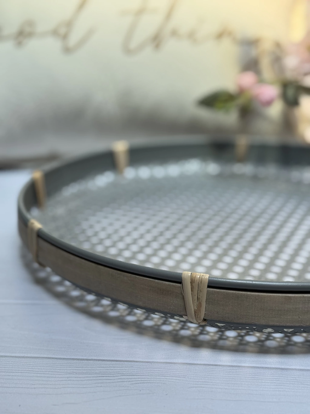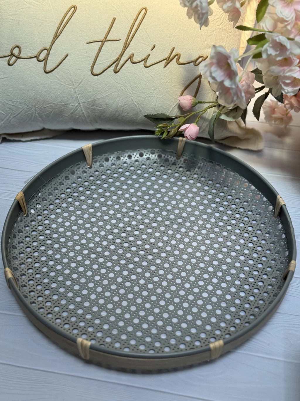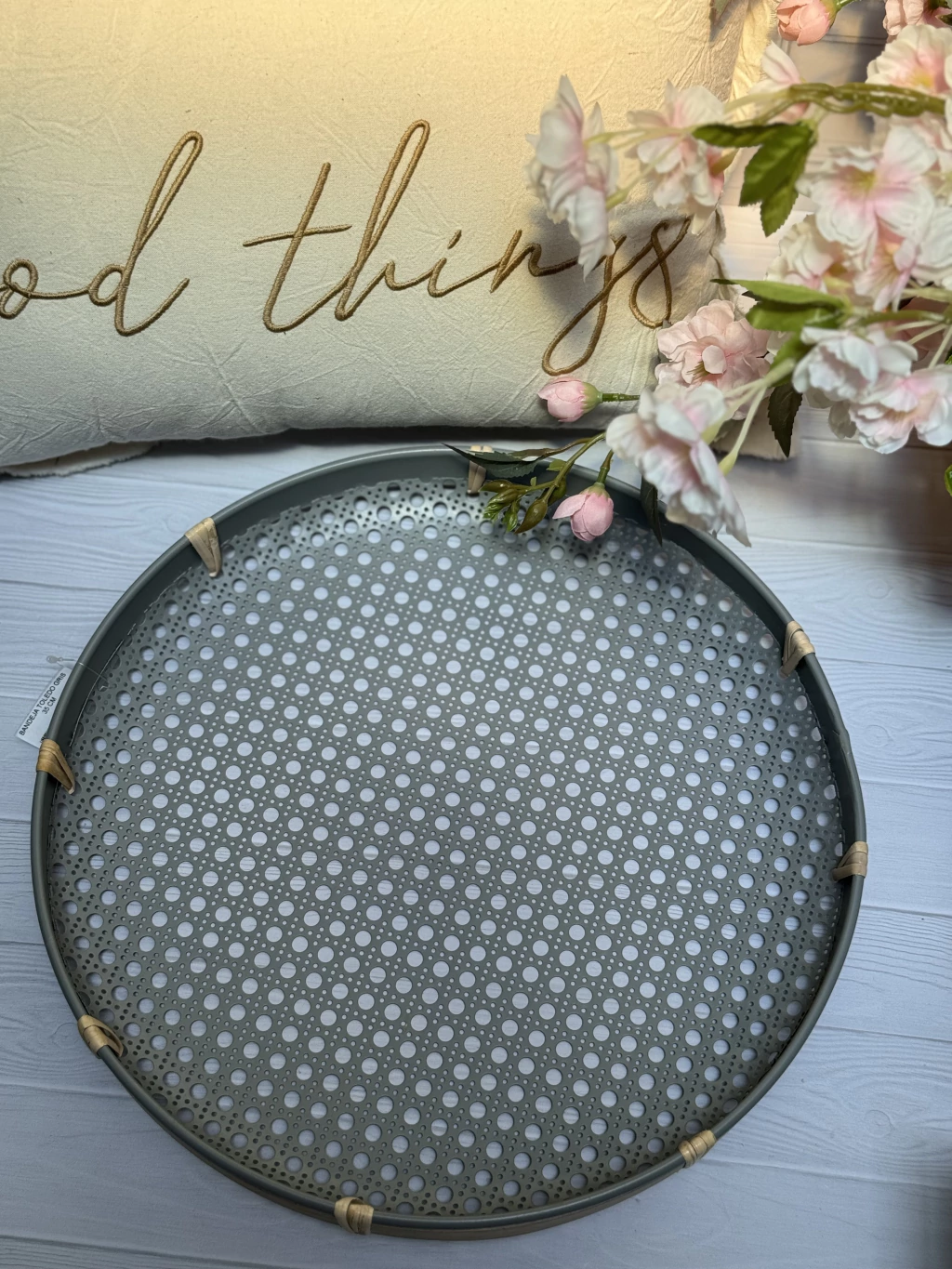 Descubrí la elegancia de nuestra Bandeja Redonda Toledo gris de hierro que mide 35 cm. Este accesorio es perfecto para servir tus aperitivos o como base decorativa en cualquier ambiente de tu hogar.