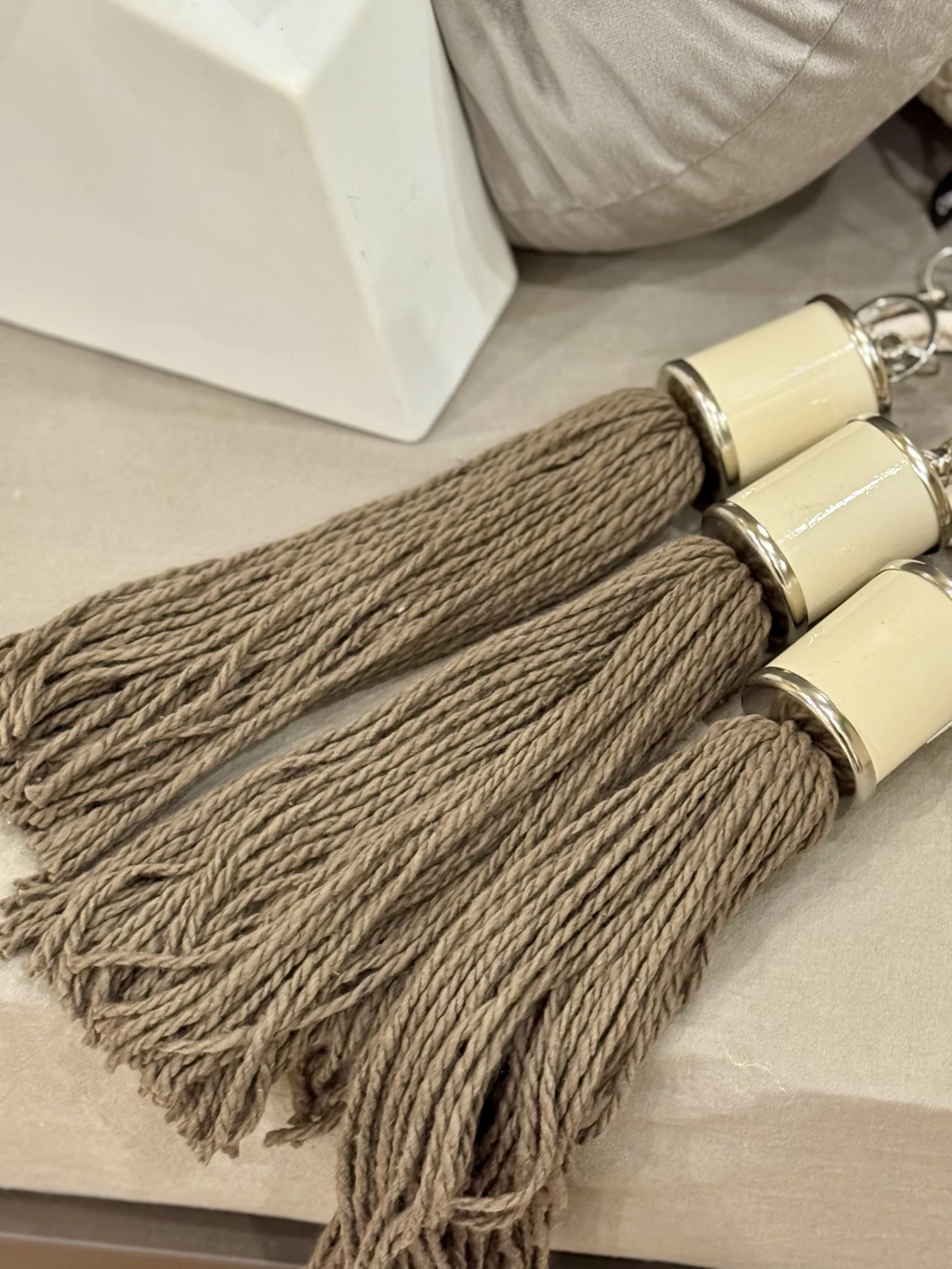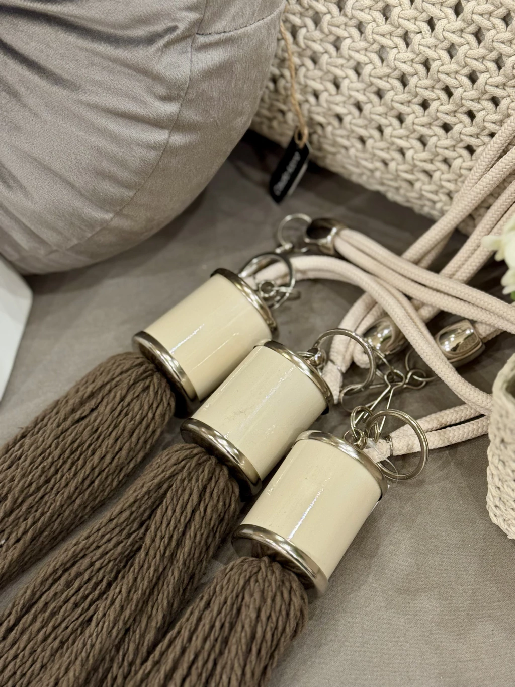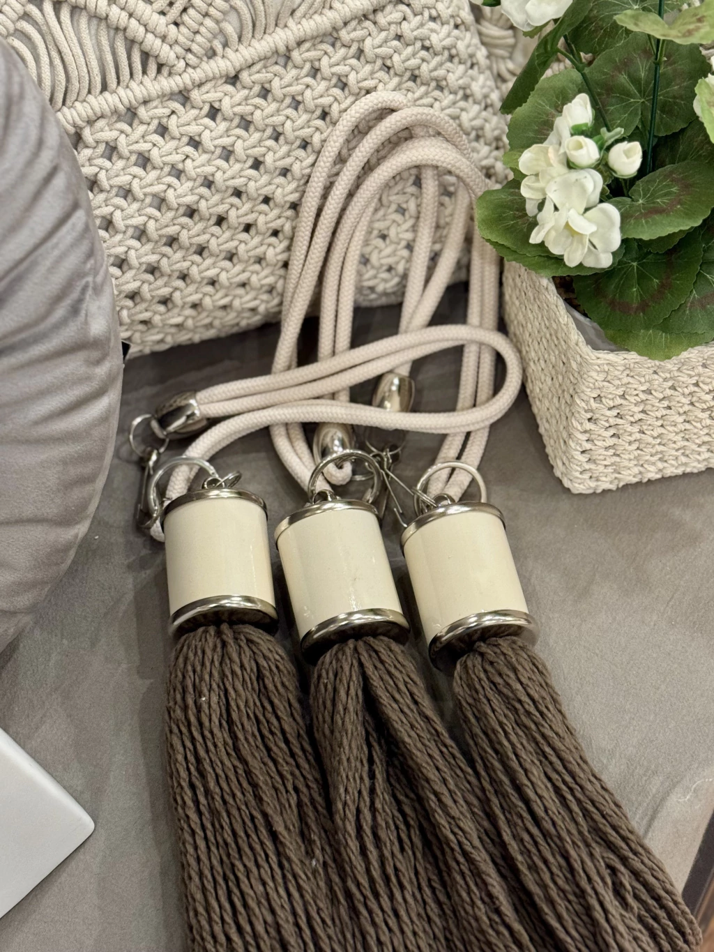 Agregá un toque delicado y sofisticado con la Borla Cali en tono chocolate. Este adorno, confeccionado en crudo e hilado chocolate, mide aproximadamente 66 cm de largo, ideal para complementar cortinas, cojines o cualquier espacio que requiera un detalle especial.