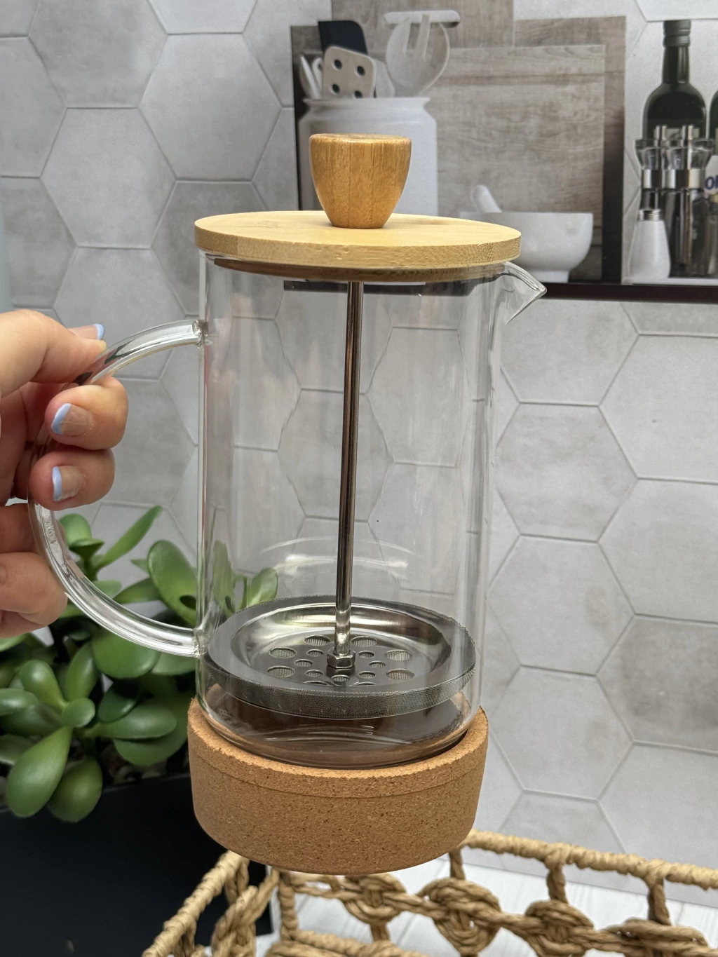 Descubre nuestra Cafetera con Émbolo de Vidrio, una opción perfecta para los amantes del café. Con una elegante tapa de bamboo y una base de corcho desmontable, combina diseño y practicidad en cada uso.