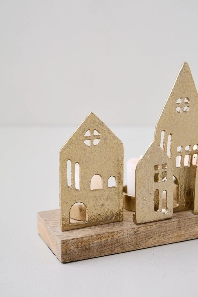 Agrega un toque cálido y sofisticado a tu hogar esta Navidad con el portavela Decor Aldea. Su acabado en aluminio dorado y base de madera combinan elegancia y naturalidad, ideal para crear ambientes acogedores.