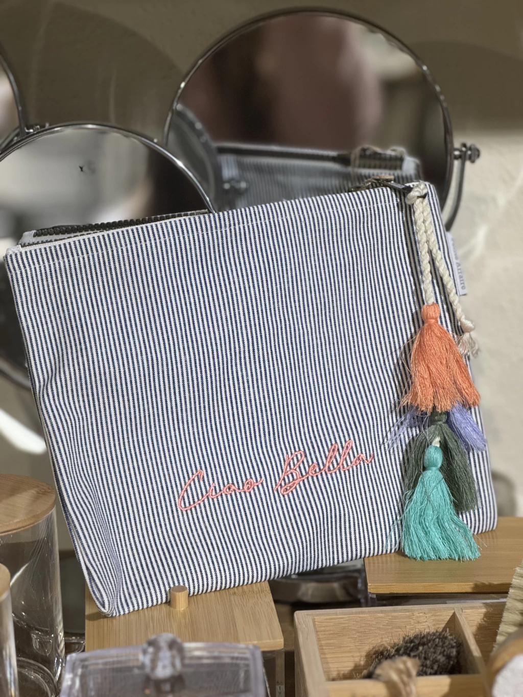 Descubre el Neceser Ciao Bella, un accesorio imprescindible para quienes buscan combinar estilo y funcionalidad. Con un atractivo diseño de líneas azules y blancas, este neceser destaca por su bordado rosa que dice "ciao bella", añadiendo un toque de elegancia a tu rutina diaria.