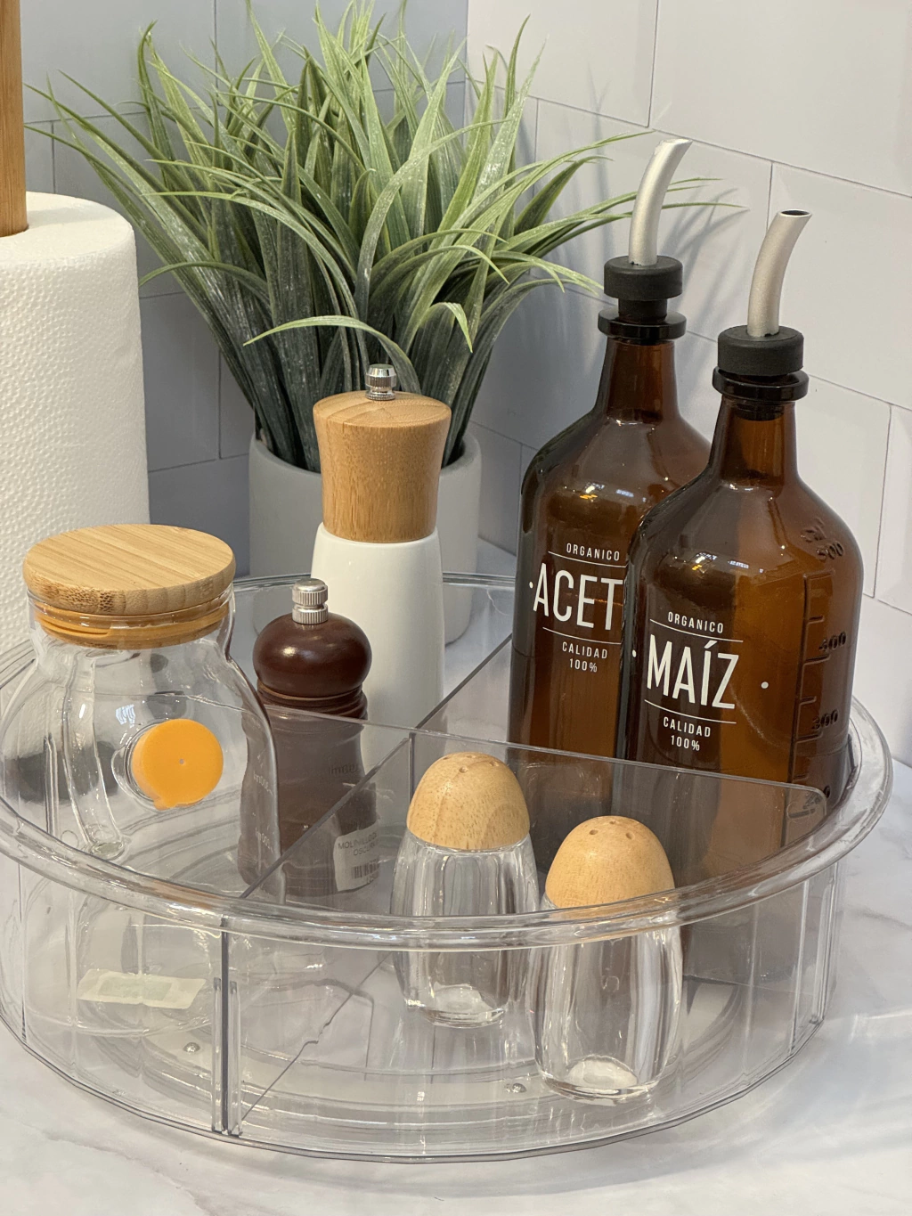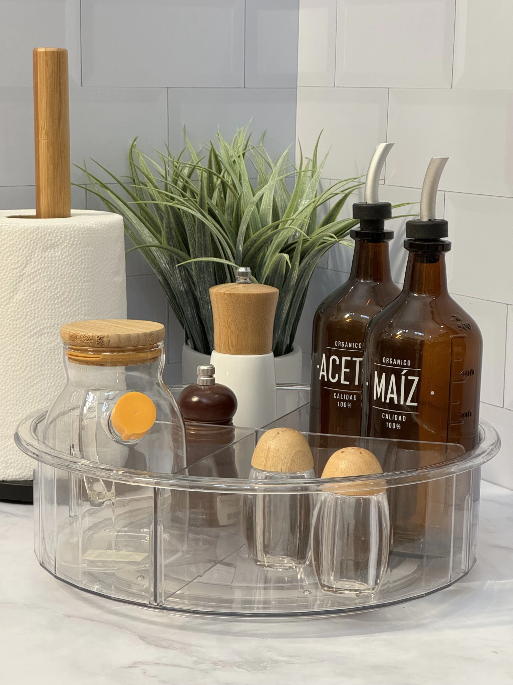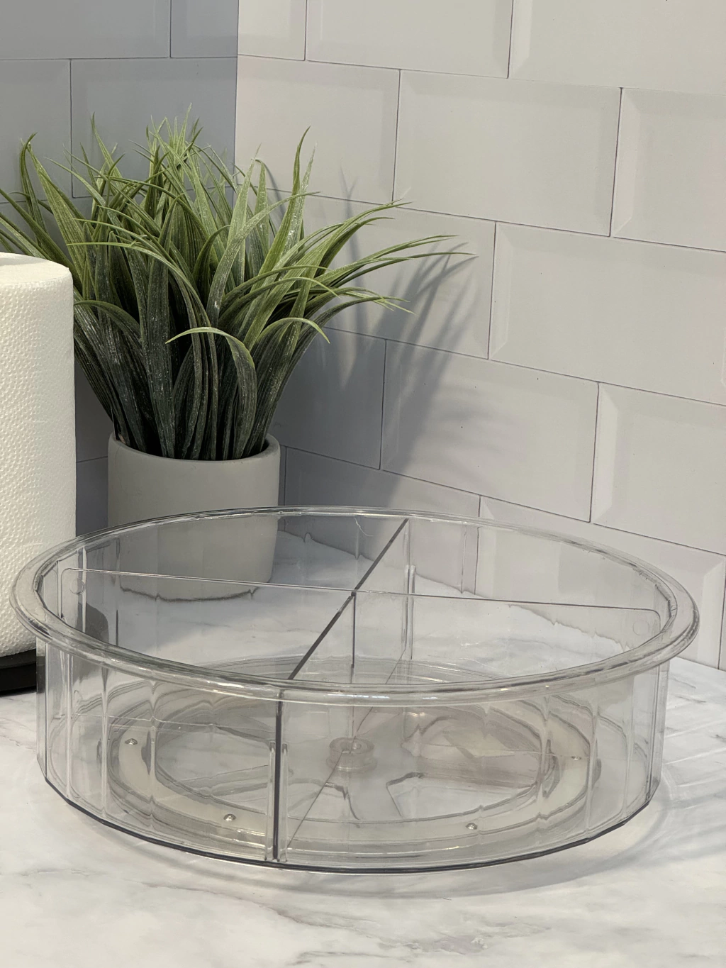 Organizador acrílico giratorio con 4 divisiones, ideal para mantener ordenados tus cosméticos o accesorios de forma práctica y cómoda. Con un diámetro de 30,5 cm y una altura de 8,5 cm, este organizador es perfecto para tucocina o baño. Mantén todo a la vista y al alcance de tu mano con este versátil y elegante producto. ¡Ordena tu espacio con estilo y calidad!