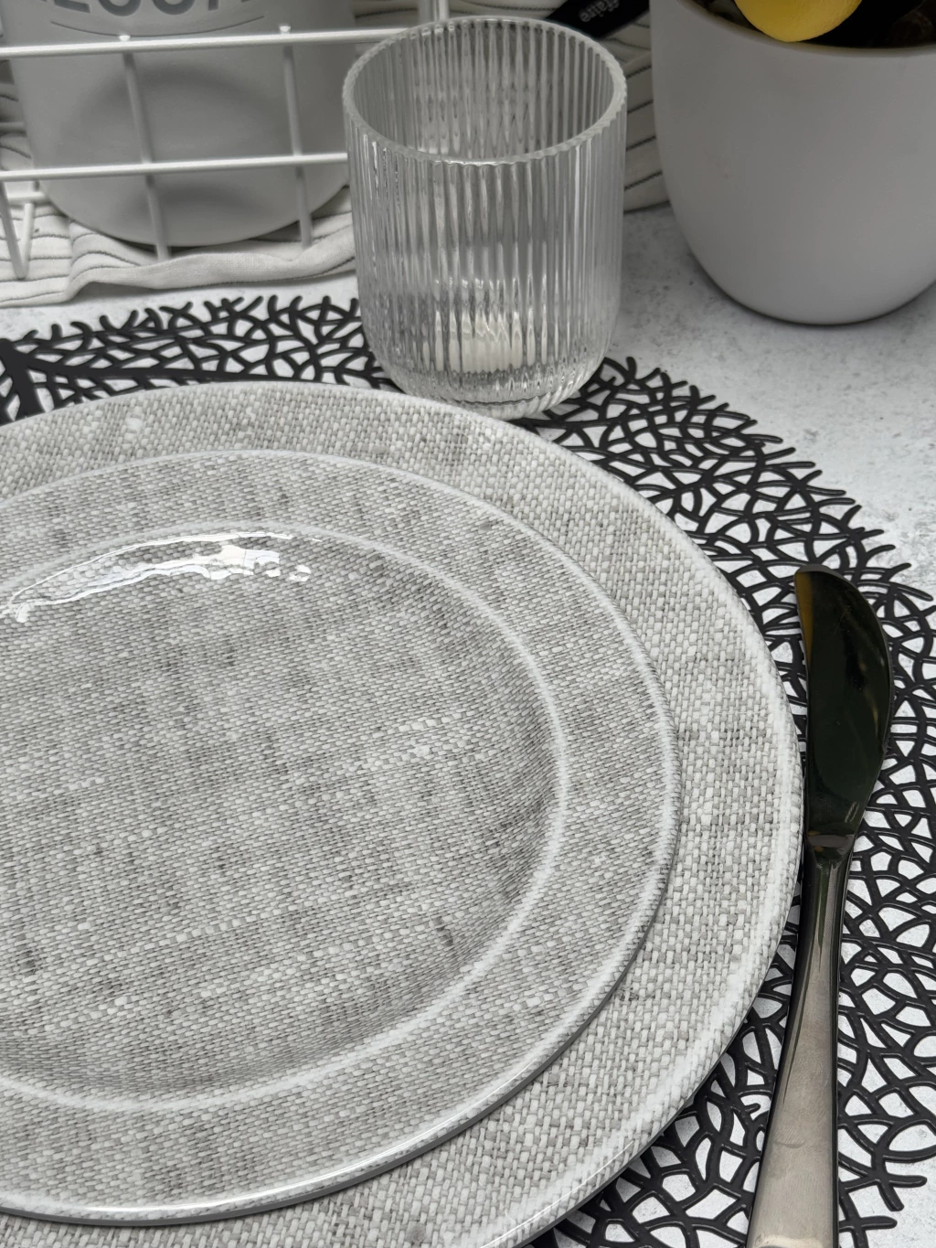 Descubrí el Plato de postre Luxor, un imprescindible para tu mesa. Fabricado en melamina, su exterior gris combina a la perfección con un encantador diseño interior que simula una trama de lino, logrando un efecto visual excepcional.
