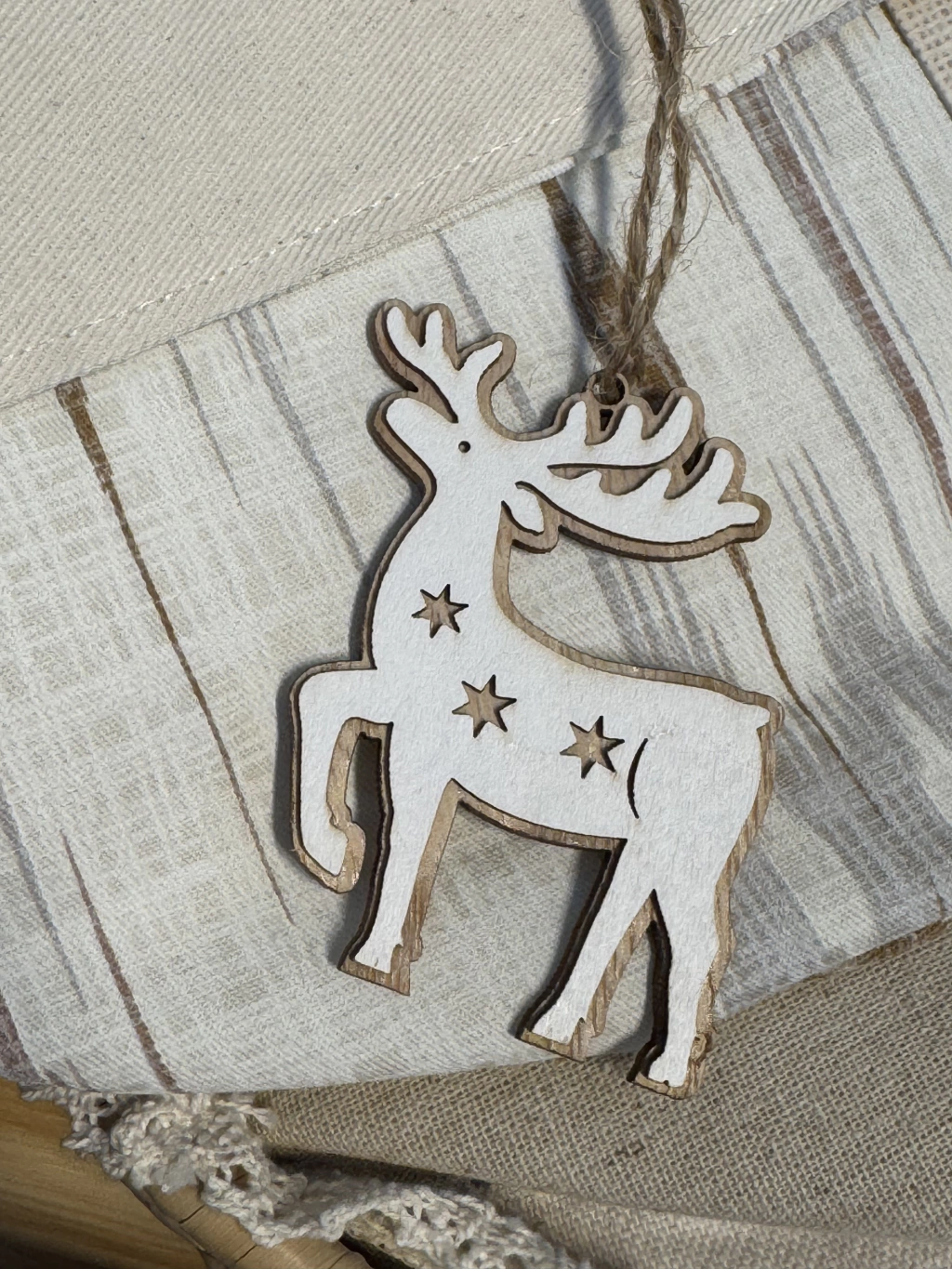 Añade un toque navideño a tu decoración con nuestro adorno colgante de reno. Color blanco y madera