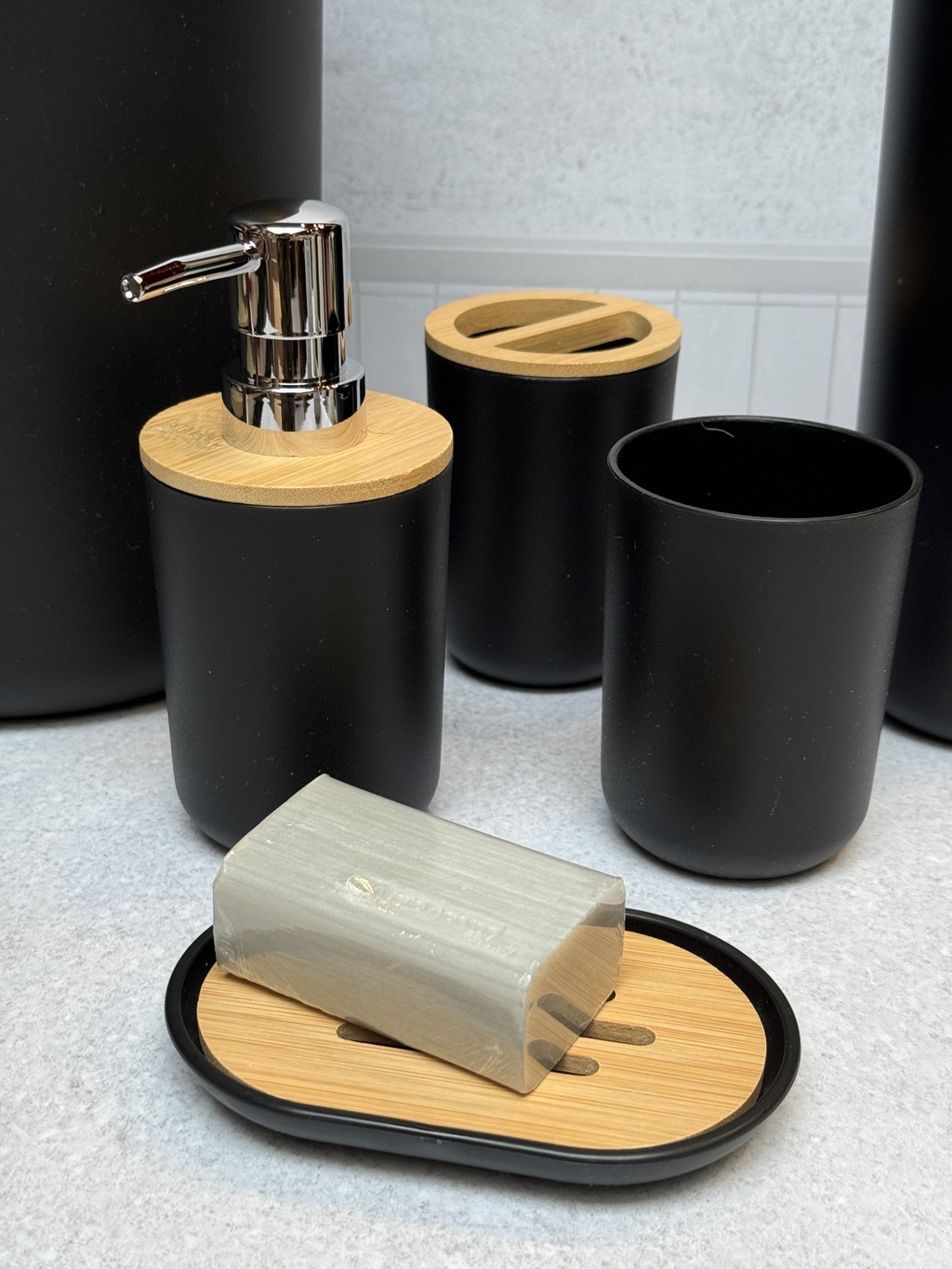 Transforma tu baño con nuestro Set de baño Tokyo en elegante color negro, que incluye 6 piezas de PVC con un hermoso detalle de bamboo. Este conjunto es perfecto para añadir un toque moderno y sofisticado a tu espacio.