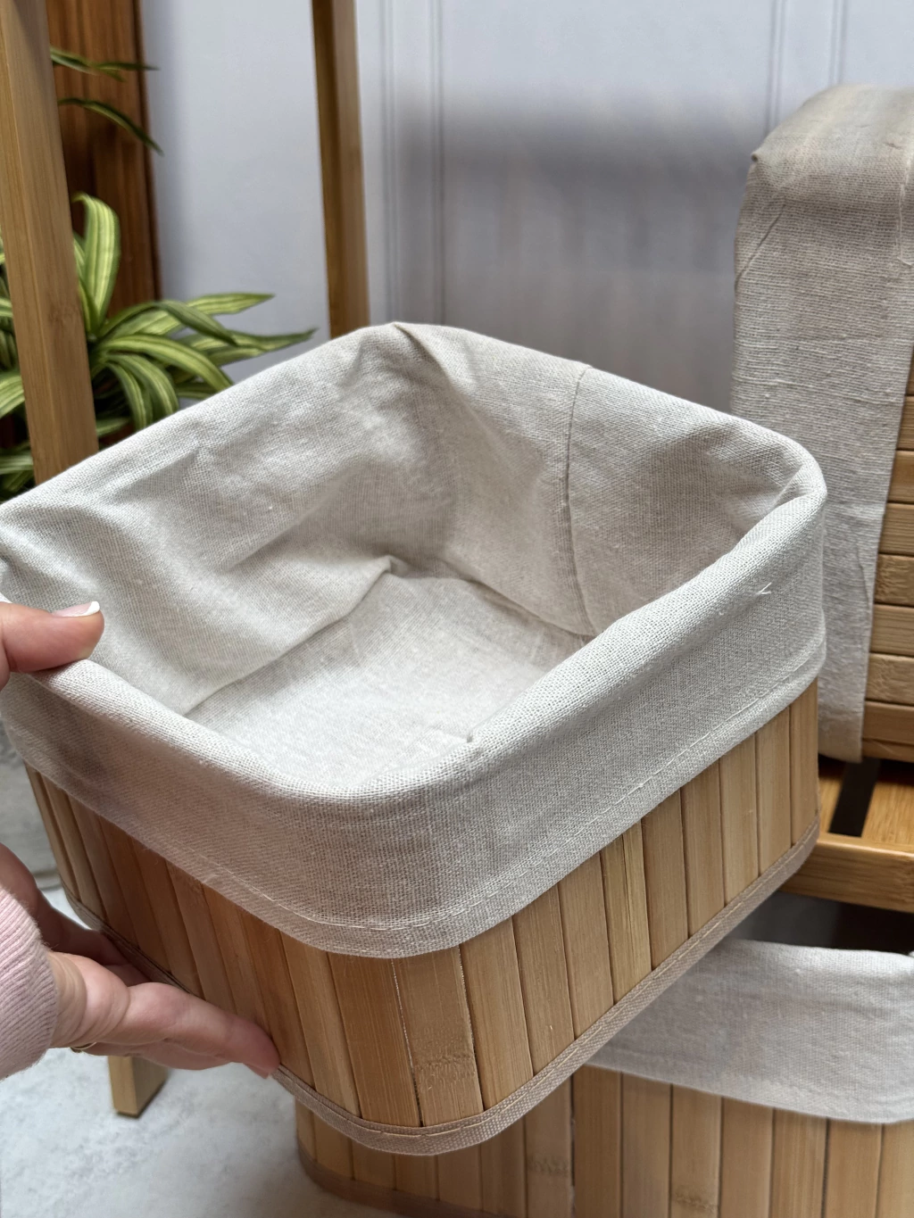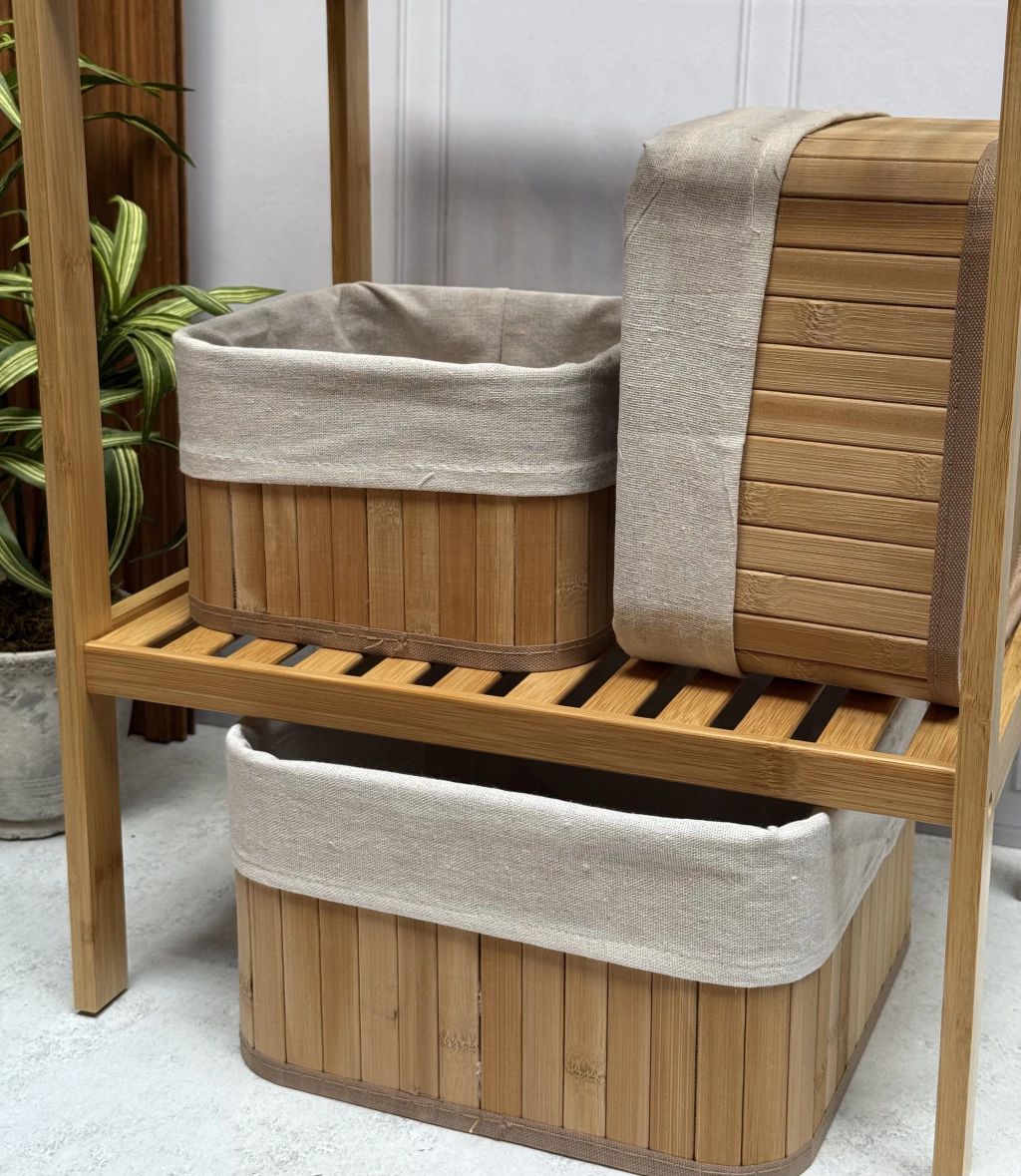 Set x 3 organizador natural de bambú y lienzo Organiza tu espacio con estilo gracias a este elegante set de organizadores. Cada pieza está diseñada con materiales naturales, combinando la resistencia del bambú y la suavidad del lienzo.