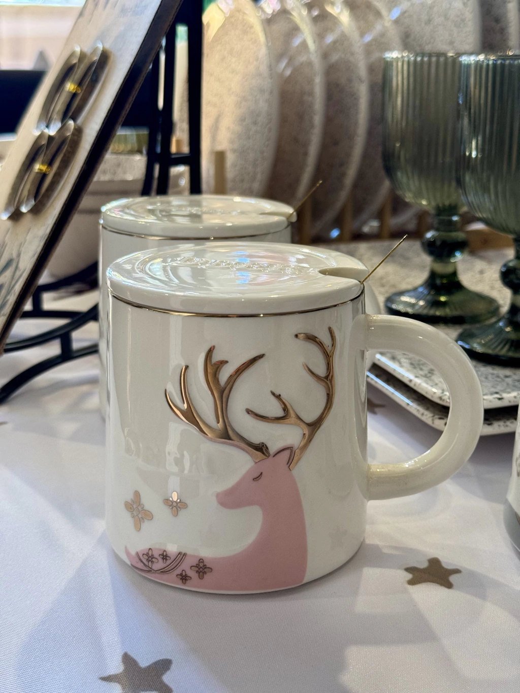 Taza ciervo pink, una pieza de cerámica que combina elegancia y funcionalidad. Con su delicada estampa de ciervo rosa y detalles en oro, esta taza de 500 ml es ideal para disfrutar tus bebidas favoritas con estilo. Incluye tapa y una cuchara dorada que realza su diseño. Sus medidas aproximadas (10 cm de diámetro x 10 cm de alto x 14 cm de ancho) la hacen perfecta para cualquier ocasión.