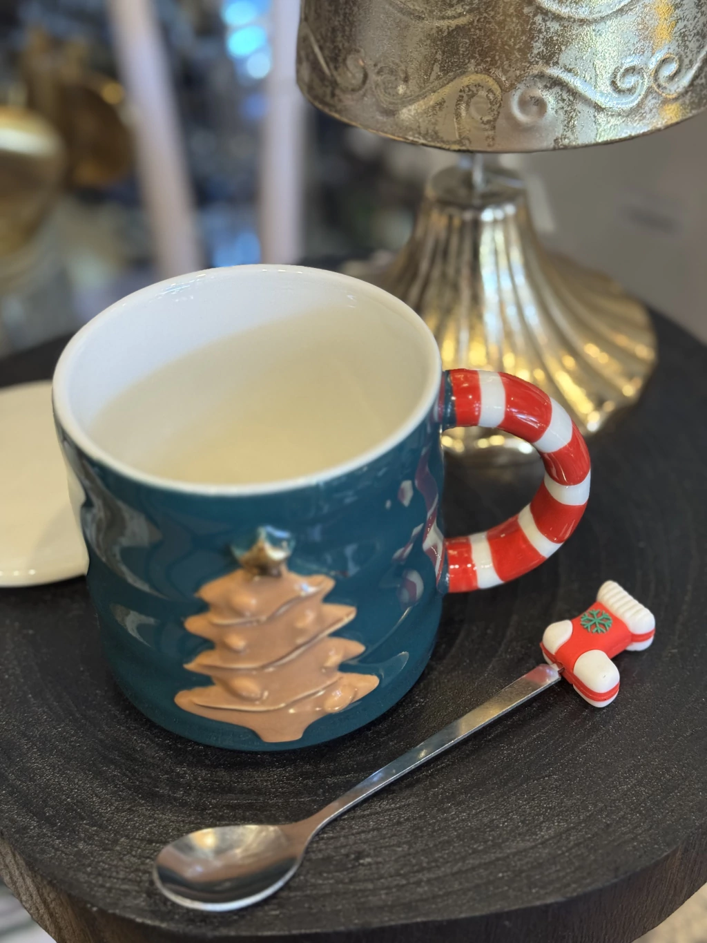 Taza verde con tapa blanca y diseño navideño único. Esta taza de 400ml con medidas aproximadas de Ø 8,5 x H 9,5 cm, presenta un hermoso árbol navideño en marrón y dorado, ideal para disfrutar tus bebidas favoritas con espíritu festivo. Incluye una cuchara en forma de bota navideña, perfecta para mezclar con estilo. Un detalle cálido y funcional que no puede faltar en tu colección navideña.